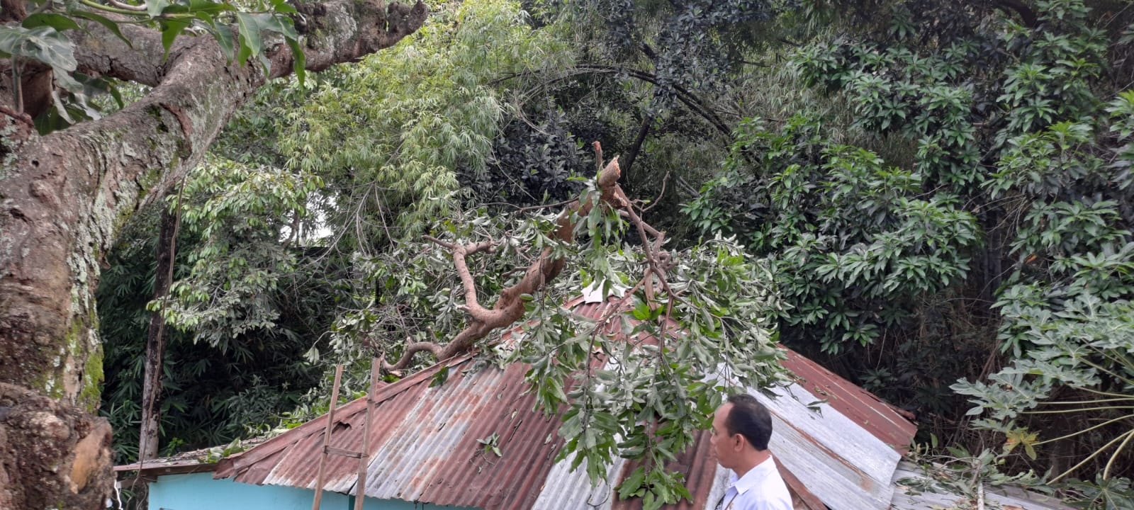 Hujan deras yang disertai angin kencang melanda kawasan permukiman warga pada Selasa (malam) sekitar pukul 21.00 WITA. Akibatnya, dahan sebuah pohon besar patah dan menimpa atap salah satu rumah warga hingga mengalami kerusakan cukup parah.